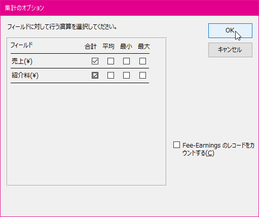集計方法を選択します。ここでは紹介料と売上の合計を選択します。