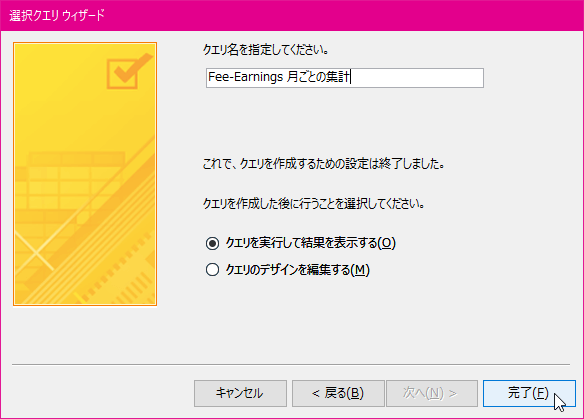 クエリ名を指定します。クエリを作成した後に行うことを選択します。クエリを実行して結果を表示するには[クエリを実行して結果を表示する]を選択、その後にクエリのデザインを編集するには[クエリのデザインを編集する]を選択して[完了]ボタンをクリックします。