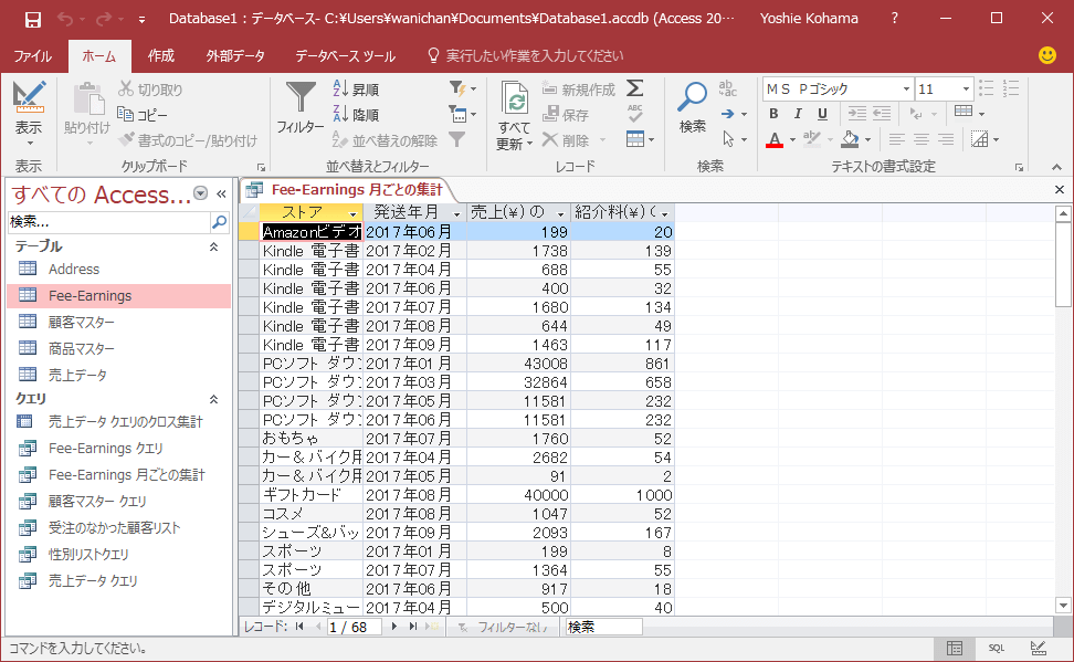 発送日 を月でグループ化: Format$([Fee-Earnings].[発送日],'mmmm yyyy')