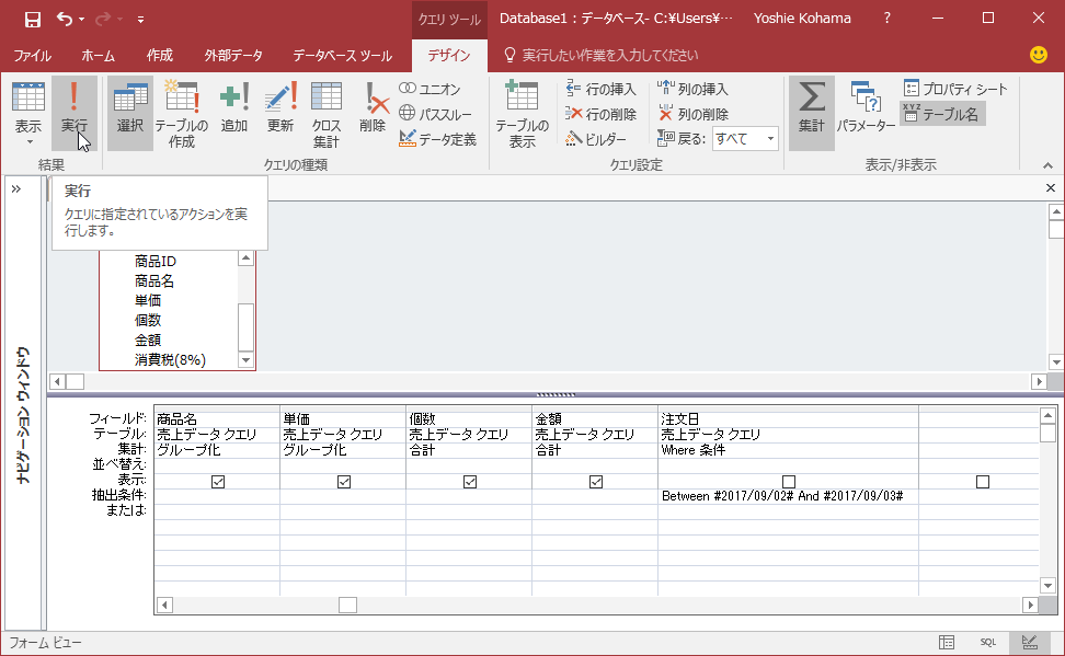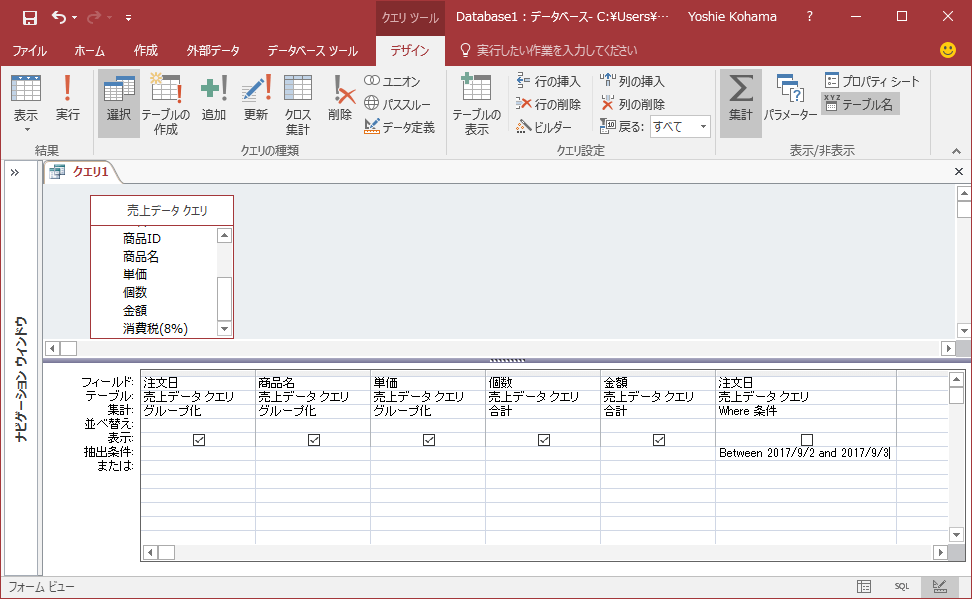 集計する前に集計の対象となるレコードを抽出するには、Where条件を使うとよいでしょう。ここでは、2017/9/2~2017/9/3の個数と金額の合計を求めてみましょう。