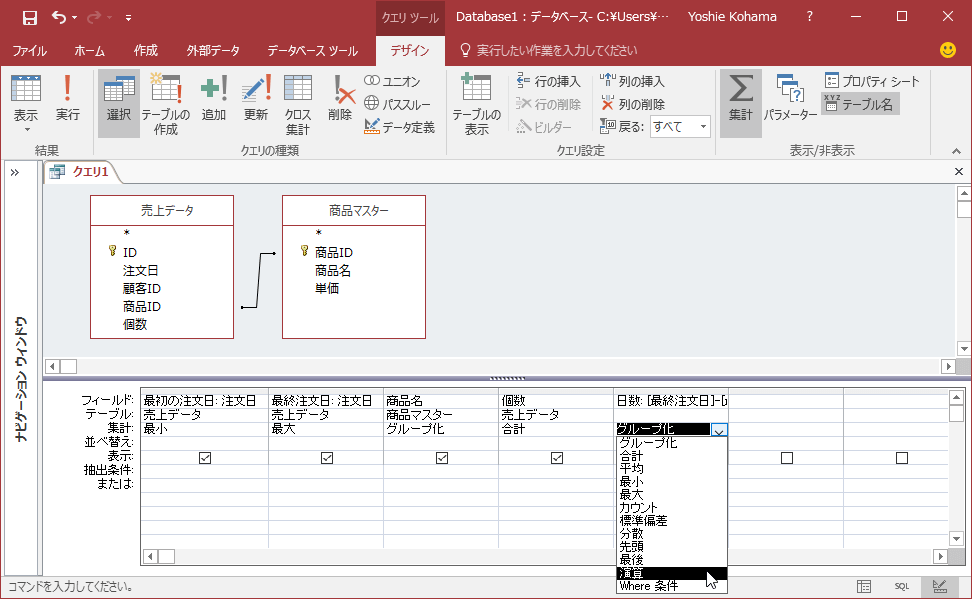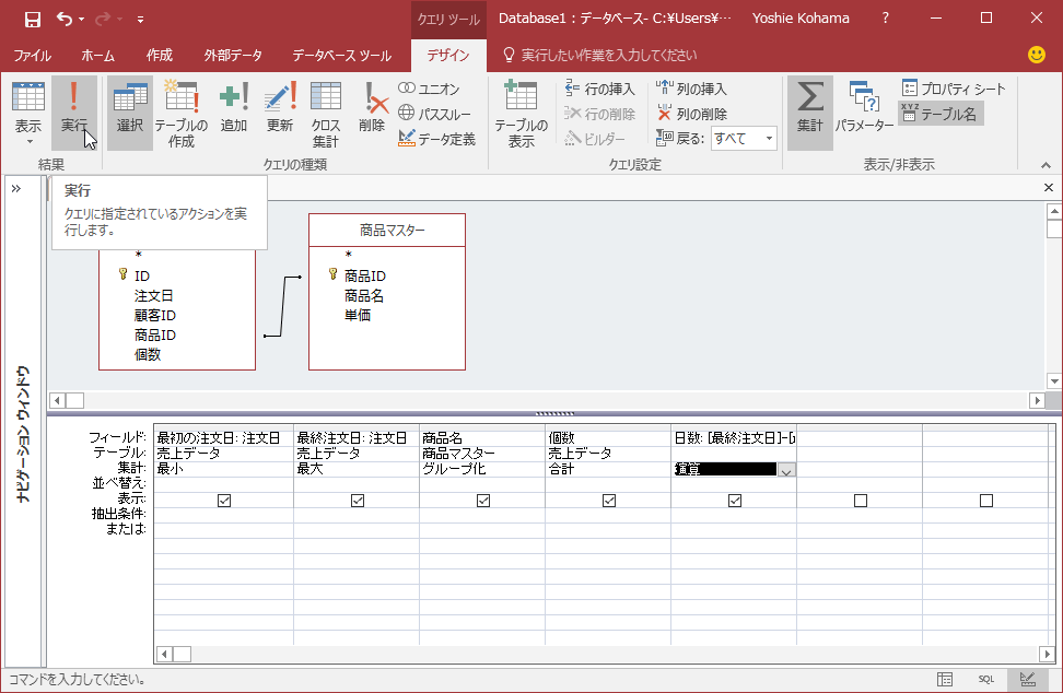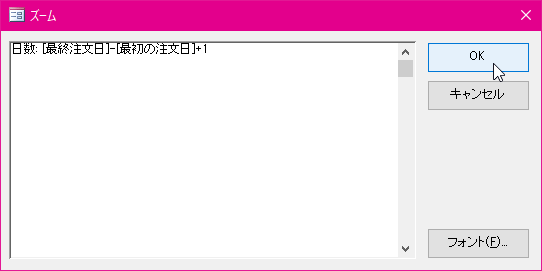 - 演算フィールドには以下のように記述します。フィールド名はそれぞれこのクエリで定義したものを指定します([注文日]ではありません)。