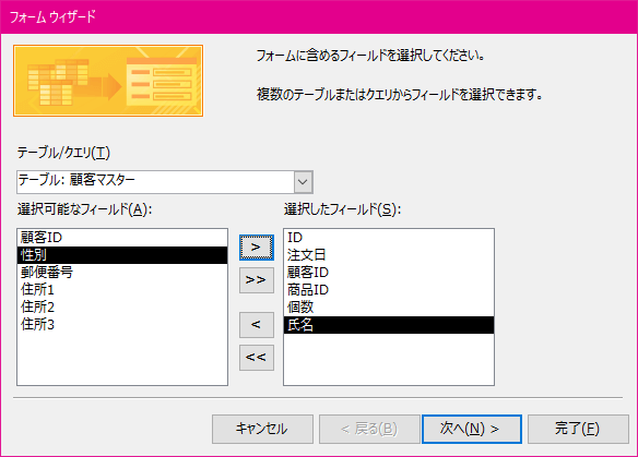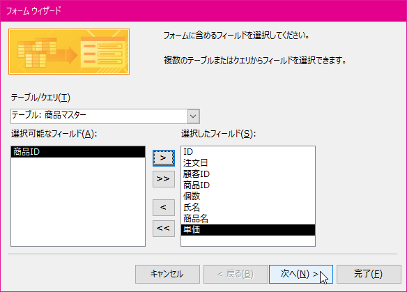 他のテーブルのフィールドを追加するには、[テーブル/クエリ]ボックスから選択して、選択していきます。一つずつ選択するには、目的のフィールドを選択して[>]ボタンをクリックしていきます。