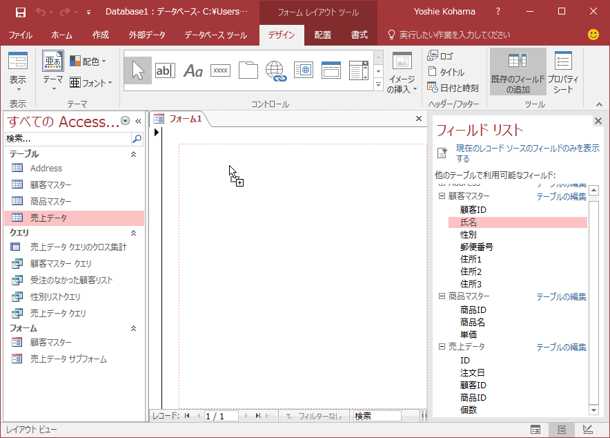 Access 2016でコントロールや書式が設定されていないフォームを作成するには、[作成]タブを開き、[フォーム]グループの[空白のフォーム]を選択して、フィールドリストを表示して、すべてのテーブルを表示し、必要なフィールドをドラッグ&ドロップしていきます。