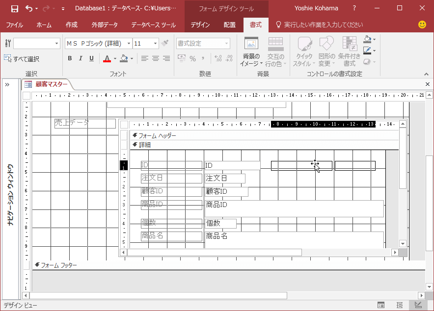 フォームをデザインビューで開き、移動したいコントロールを選択して、移動先までドラッグします。ラベルとコントロールは対になっているため、いずれか選択してドラッグしても一緒に移動します。