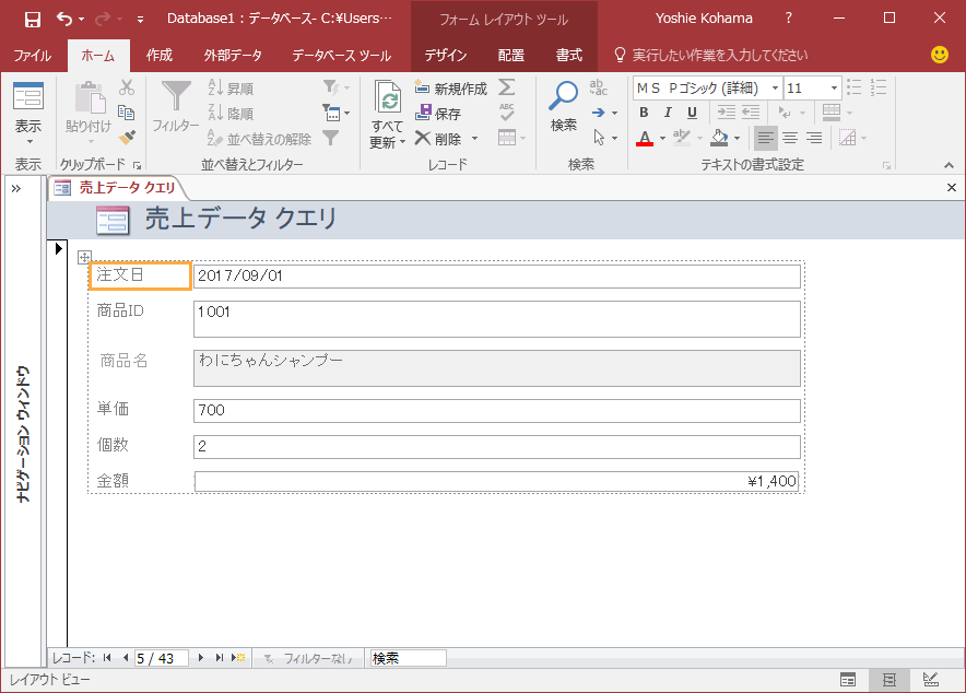 - フォームビューに切り替えて、計算結果が表示されることを確認します。