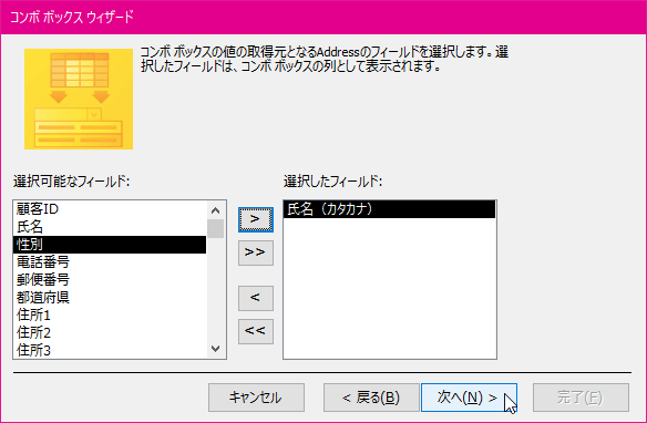 - 検索対象のフィールドを指定します。ここではふりがなフィールドを選択して[>]ボタンをクリックします。
