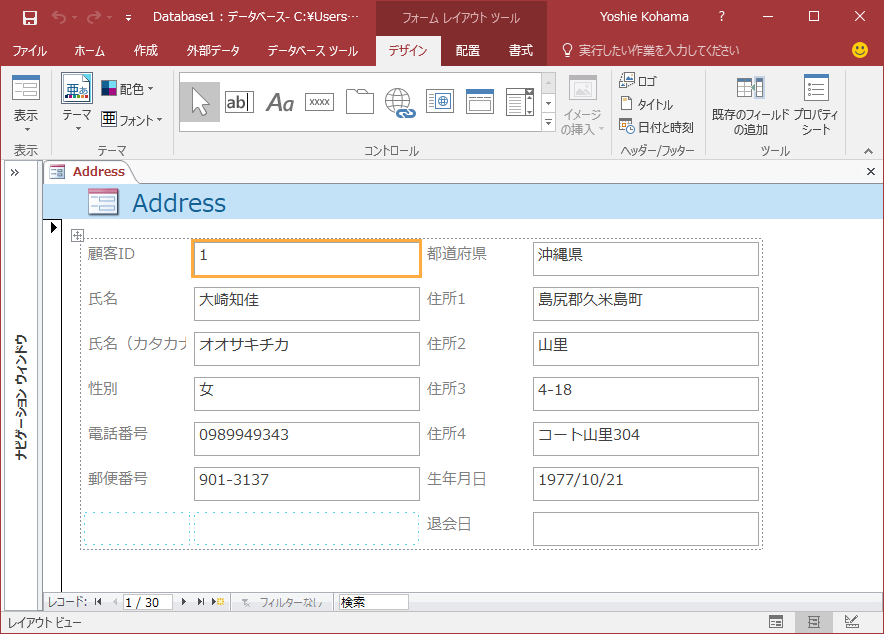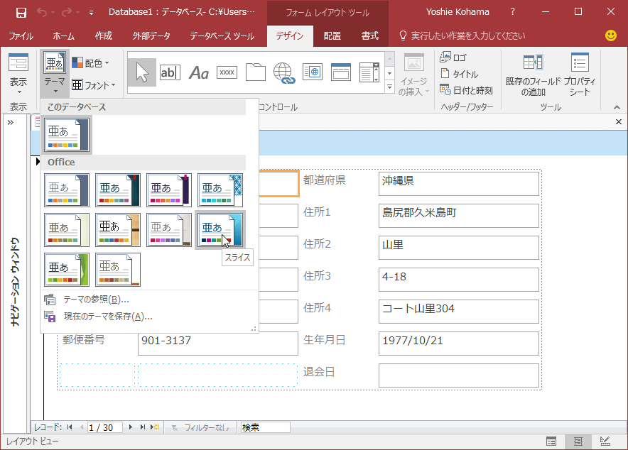Access 2016でフォームにテーマを適用するには、レイアウトビューまたはデザインビューに切り替えて、[フォームデザインツール]の[デザイン]タブを開き、[テーマ]グループの[テーマ]一覧から選択します。配色やフォントを変更することも可能です。