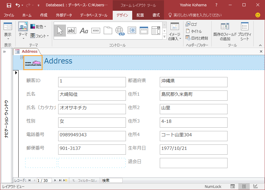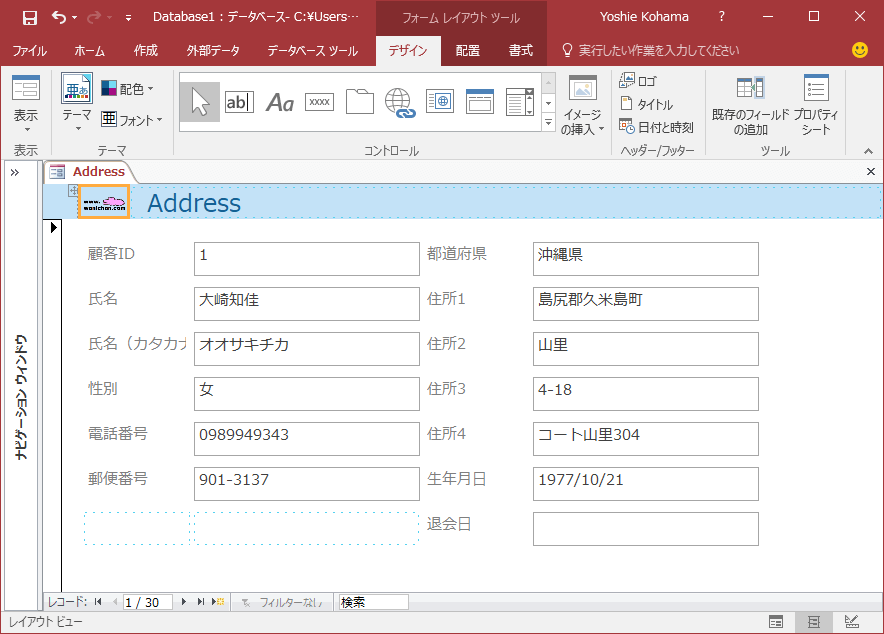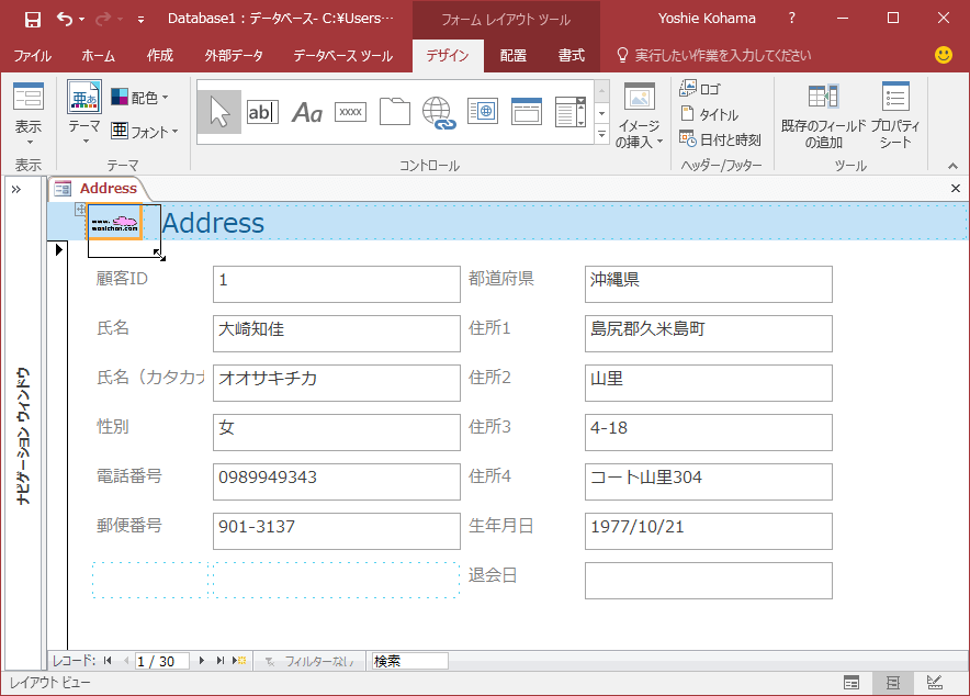 ロゴとして使用する画像をフォームに挿入するには、[フォームデザインツール]の[デザイン]タブを開き、[ヘッダー/フッター]グループの[ロゴ]を選択して、ロゴ画像を選択します。