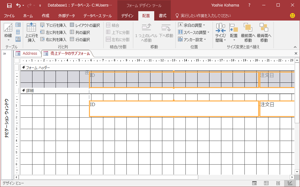 - [フォームデザインツール]の[配置]タブを開いて、[テーブル]グループの[集合形式]を選択します。