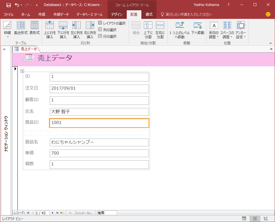 - [フォームデザインツール]の[配置]タブを開きます。