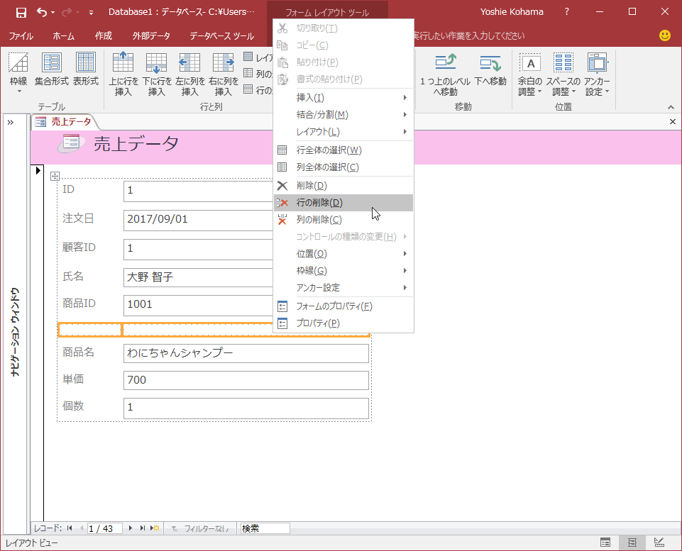 フォームコントロールを挿入するためのスペースを確保するために、フォームに行を挿入することができます。上に行を挿入するには、レイアウトビューまたはデザインビューに切り替えて挿入する行の下の行のコントロールを選択し、[フォームデザインツール]の[配置]タブを開いて、[行と列]グループの[上に行を挿入]を選択します。