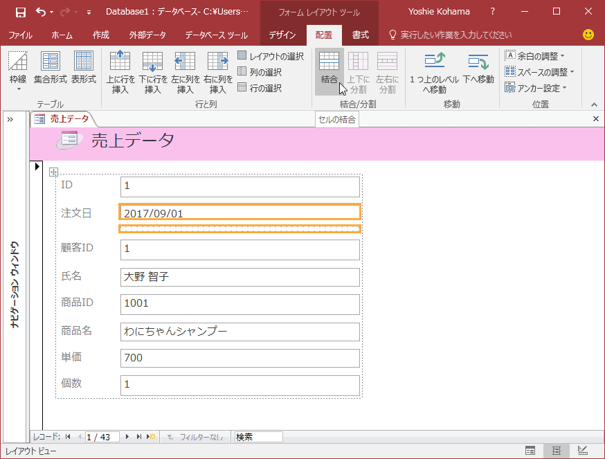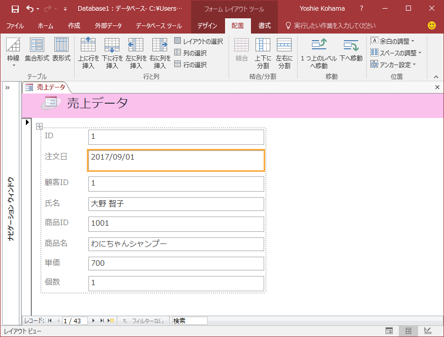 - オブジェクトを選択して[フォームデザインツール]の[配置]タブを開きます。