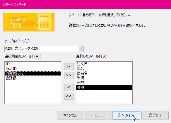 - レポートに含めるフィールドを選択し、[次へ]ボタンをクリックします。