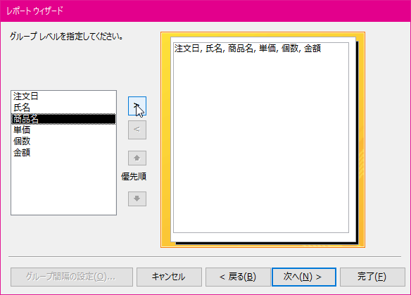 - グループレベルを指定します。ここでは[商品名]を選択して[>]ボタンをクリックします。