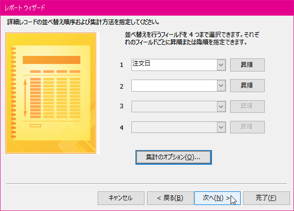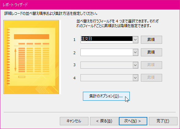- 詳細レコードの並べ替え順序を指定します。集計方法を指定するには[集計のオプション]ボタンをクリックします。