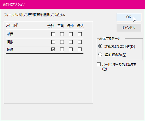 - [集計のオプション]ダイアログボックスでフィールドに対して行う演算と表示するデータを選択して[OK]ボタンをクリックします。