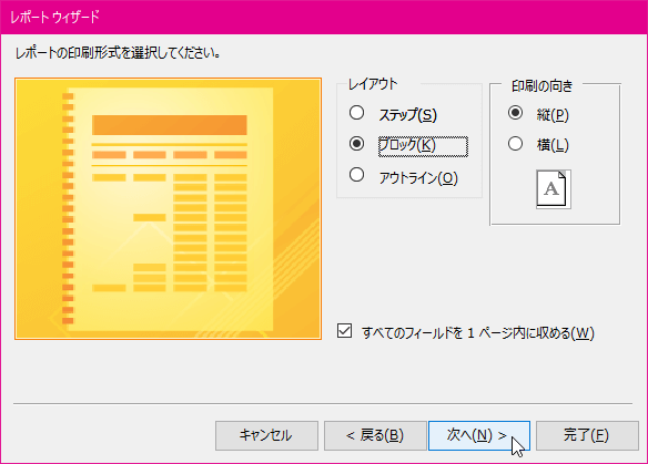 - レポートウィザードに戻ったら[次へ]ボタンをクリックします。