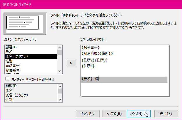 ラベルに印字するフィールドと文字を指定します。ラベルのレイアウトのグレー行にフィールドを追加します。まず、[郵便番号]フィールドを選択して[>]ボタンをクリックします。