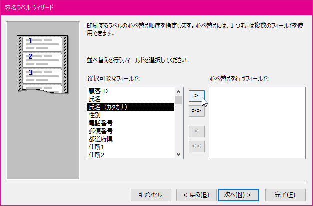 印刷するラベルの並べ替え順序を指定します。並べ替えには1つまたは複数のフィールドを使用できます。並べ替えを行うフィールドを選択して[>]ボタンをクリックして、[次へ]ボタンをクリックします。
