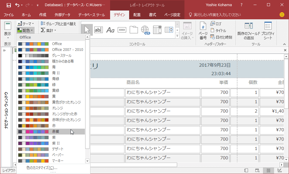 組み込みのテーマを適用したあとに配色を変更することで、見栄えのいいデザインを簡単にカスタマイズできます。レイアウトビューでフォームを開いて[レポートレイアウトツール]の[デザイン]タブを開き、[配色]一覧から異なるテーマの配色を選択します。