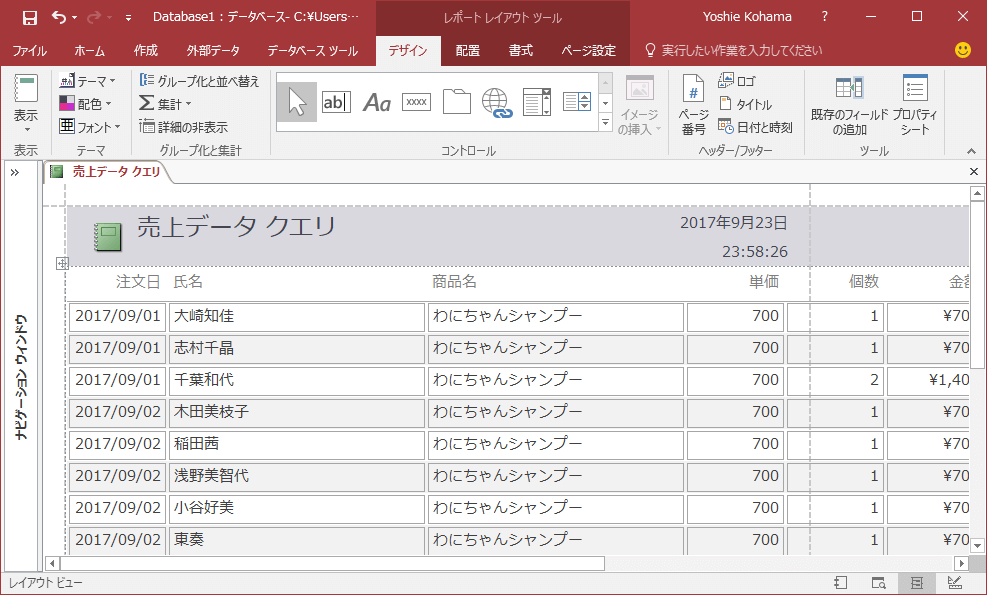 - レイアウトビューに切り替えて、[レポートレイアウトツール]の[デザイン]タブを開きます。