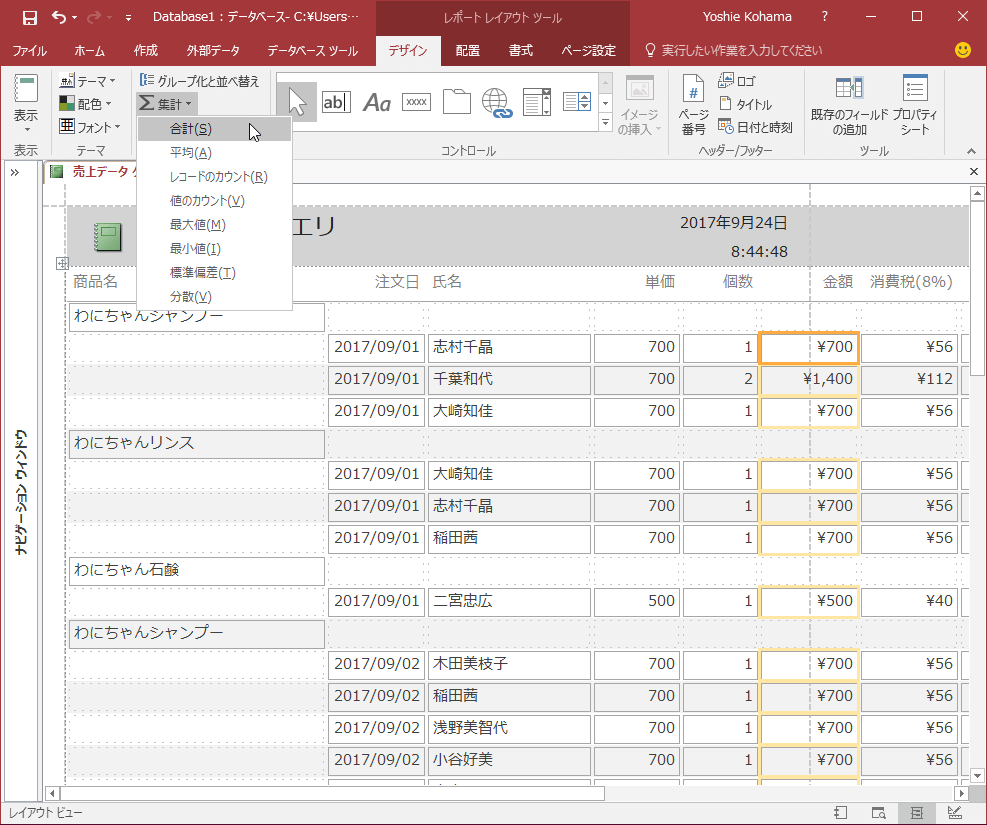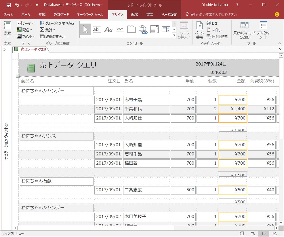 - 金額フィールドの任意の値を選択し、[レポートレイアウトツール]の[デザイン]タブを開きます。