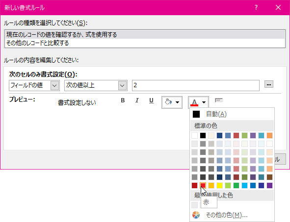 - 書式設定では、赤色に変更するので、フォントの色一覧から赤色を選択します。