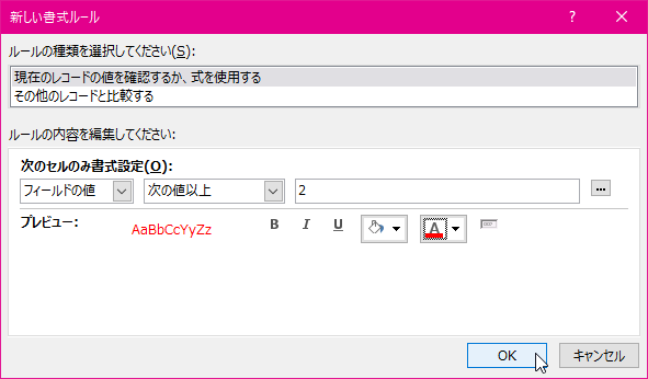 - [ルールの内容を編集してください]の欄にて、フィールドの値が2以上の場合、というルールを設定する場合、以下の図のように[フィールドの値][次の値以上][2]と入力します。