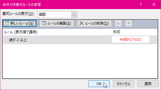 - 最後に[条件付き書式の管理]ダイアログボックスの[OK]ボタンをクリックします。