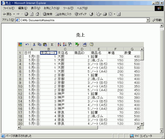 WebページでありながらInternet Explorer上でExcelのように操作することができる形式に保存する方法について説明します。