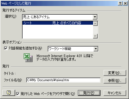 ワークシート対話機能付きで保存とは、WebページでありながらInternet Explorer上でExcelのように操作することができる形式に保存するということです。