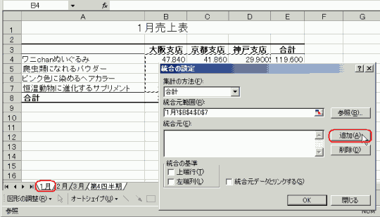 まずは1月のシートを選んで、集計するデータの範囲を指定していきます。