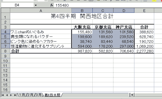 同様に2月、3月とデータ範囲をマウスで範囲選択します。