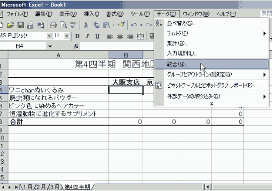 関西地区の合計を求めてみましょう。データ部分の左上にカーソルを移動して、[データ]→[統合]をクリックします。
