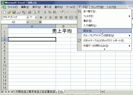 平均セルのA3にカーソルを移動させて、[データ]→[統合]をクリックします。