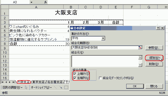 [統合元範囲]にカーソルを移動させてから、大阪支店のシートを選択して、表全体を囲んで[追加]ボタンをクリックします。