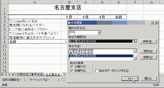 名古屋支店だけ取扱商品が多いので、表全体を選択しなおして追加し、最後にOKボタンをクリックします。