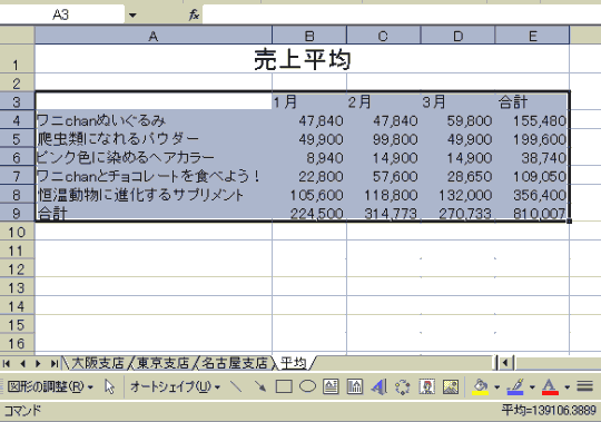 A3セル以下にそれぞれの売上平均を求めましょう。