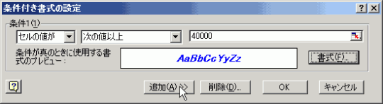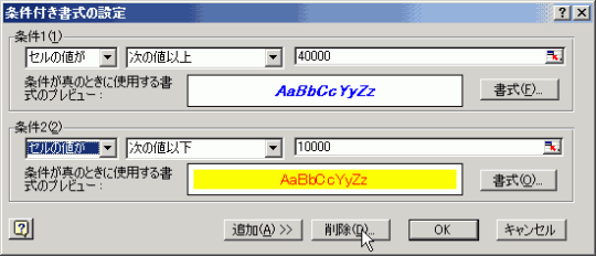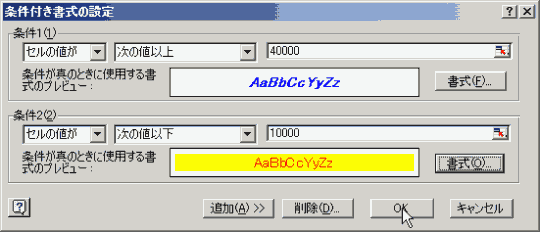 では、10000以下の場合はセルの塗りつぶしを黄色で赤色の文字、40000以上の場合は青色で太字で斜体文字になるようにするにはどのようにすればいいでしょうか?