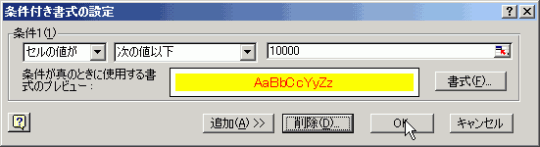「セルの値が」「次の値以下」を選択された状態にしておき、「10000」と入力して、[書式]ボタンをクリックします。