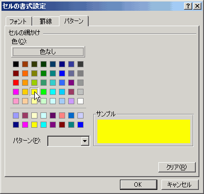 セルの書式設定の[パターン]タブをクリックして、セルの網掛けの色の一覧から黄色をクリックします。