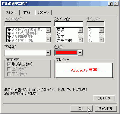 [フォント]タブをクリックして、色を赤に指定して、[OK]ボタンをクリックします。