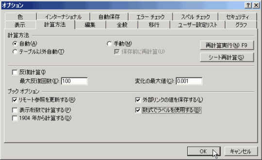 [ブックオプション]設定オプションの中の「数式でラベルを使用する」にチェックをつけて、OKボタンをクリックします。
