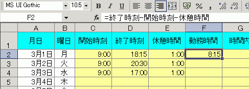 F2セルにカーソルを移動させてから、「=終了時刻-開始時刻-休憩時間」と入力してみてください。