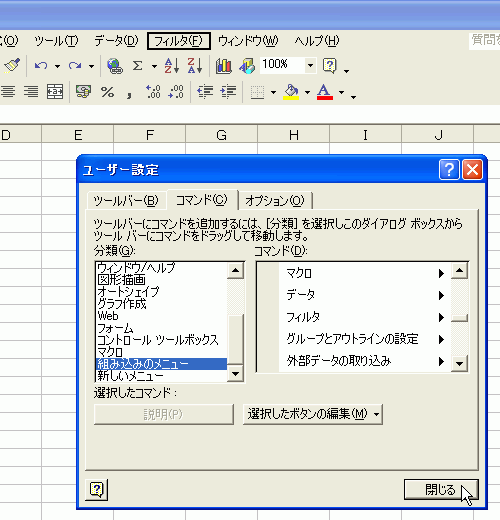 - 追加が終わったら[ユーザー設定]ダイアログボックスの[閉じる]ボタンをクリックします。