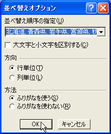 - [並べ替えオプション]ダイアログボックスの[方法]グループに「ふりがなを使う」または「ふりがなを使わない」を選択して、[OK]ボタンをクリックします。