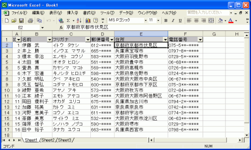| 2 | 1 | 伊藤 武 | イトウ タケシ | 612-**** | 京都府京都市伏見区 | 075-5**-**** |