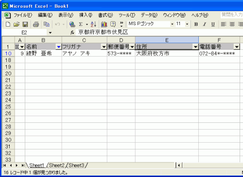 | 16 | 15 | 篠原 信子 | シノハラ ノブコ | 590-**** | 大阪府堺市 | 0729-3*-**** |