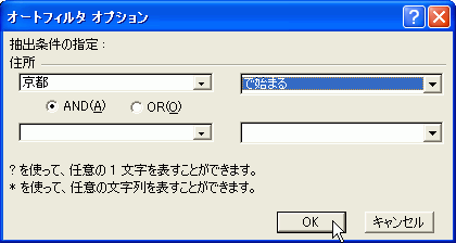 - [オートフィルタオプション]ダイアログボックスの[住所]の欄には「京都」と入力します。