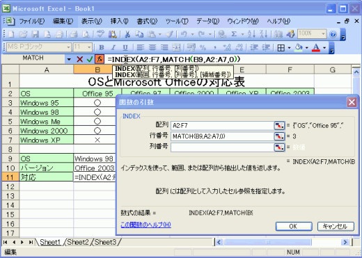 - [関数の引数]ダイアログボックスが上位レベルの関数名に切り替わり、数式バーではすべての数式が太字表示された